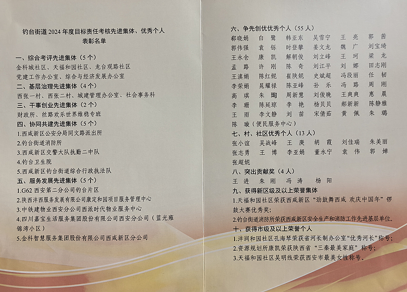 近日,灃西集團(tuán)子公司——陜西灃西服務(wù)發(fā)展有限公司(以下簡(jiǎn)稱(chēng)“灃西服務(wù)”)北部回遷片區(qū)康定和園項(xiàng)目榮獲釣臺(tái)街道黨工委、釣臺(tái)街道辦事處頒發(fā)的2024年度目標(biāo)責(zé)任考核“服務(wù)發(fā)展先進(jìn)集體”榮譽(yù)稱(chēng)號(hào),標(biāo)志著灃西服務(wù)在“紅色物業(yè)”黨建品牌建設(shè)與服務(wù)品質(zhì)提升方面實(shí)現(xiàn)了雙重突破為構(gòu)建和諧、文明的社區(qū)環(huán)境,貢獻(xiàn)了力量贏(yíng)得了良好的社會(huì)聲譽(yù)和口碑?。