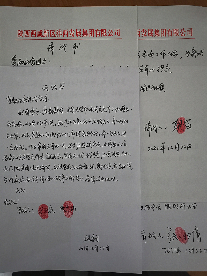 灃西發(fā)展集團(tuán)黨員干部請(qǐng)戰(zhàn)書上錚錚誓言、鮮紅手印