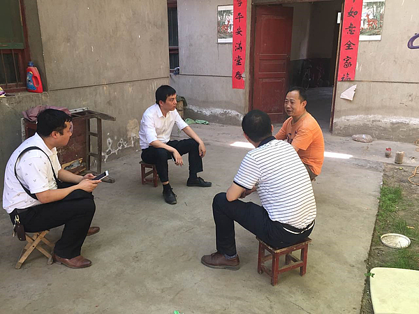 海綿城市技術中心幫扶干部(石戰航,左二)初次來到楊俊敏(右上)家中,他與大家親切熱情的交流,他的善良純樸給人留下深刻印象