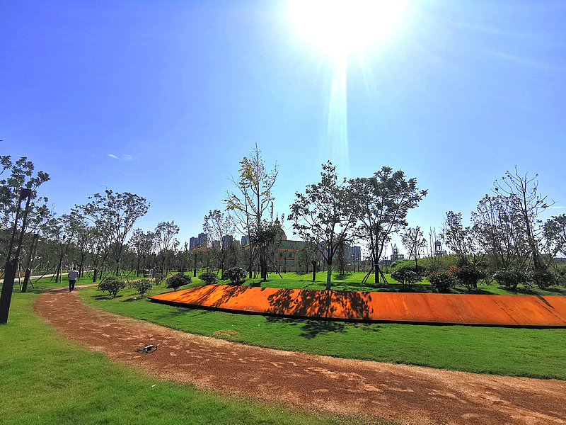 創(chuàng)新港綠楔:位于西部科技創(chuàng)新港科創(chuàng)板塊兩側(cè),東側(cè)為地鐵五號線,總占地37.5萬平方米,現(xiàn)已建成開放24.9萬平方米。通過四條楔形綠地連接南北生態(tài)環(huán)境,以水景湖系為主線,形成多元化雨洪調(diào)蓄系統(tǒng),配備多樣化戶外運動設(shè)施,通過綠化造景將自然風光與周邊建筑緊密融合,構(gòu)成整體化生態(tài)綠廊體系,展現(xiàn)積極向上、朝氣蓬勃的學鎮(zhèn)風貌。