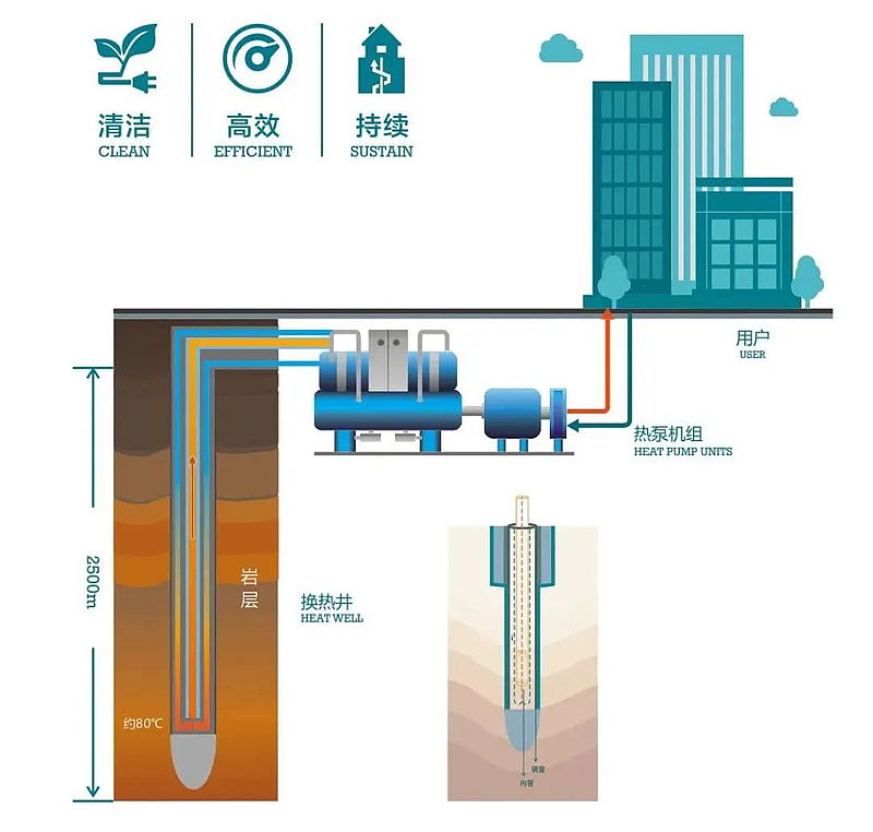 “地?zé)崮茏鳛橐环N儲量豐富、分布廣泛的可再生能源,環(huán)保且經(jīng)濟。”陜西西咸新區(qū)灃西新城能源發(fā)展有限公司(以下簡稱“灃西能源公司”)負責(zé)人說。中深層地?zé)岬芈窆芄峒夹g(shù)是灃西新城探索的一種新型綠色供熱技術(shù),其原理是通過鉆機向地下2—3千米深處鉆孔,在鉆孔中安裝封閉的金屬套管換熱器,通過換熱介質(zhì)導(dǎo)出地下熱能,并通過地面熱泵機組、輸配系統(tǒng)向地面建筑物供熱。該技術(shù)“取熱不取水”,實現(xiàn)了地?zé)豳Y源低影響開發(fā)、高效率利用。