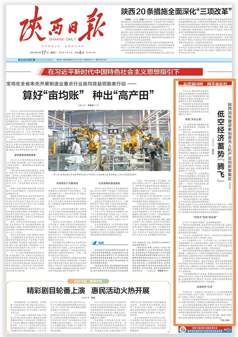 近日,陜西日報頭版刊發(fā)《陜西加快建設(shè)秦創(chuàng)原無人機產(chǎn)業(yè)創(chuàng)新聚集區(qū)——低空經(jīng)濟(jì)蓄勢“騰飛”》,報道西咸新區(qū)作為秦創(chuàng)原總窗口在低空經(jīng)濟(jì)發(fā)展中率先成形起勢,打造西部低空經(jīng)濟(jì)發(fā)展先行示范區(qū),為高質(zhì)量發(fā)展不斷注入強勁動能。自2023年起,灃西科創(chuàng)搶抓低空經(jīng)濟(jì)新賽道,提前布局無人機產(chǎn)業(yè),在產(chǎn)業(yè)氛圍營造、產(chǎn)學(xué)研合作、產(chǎn)業(yè)配套服務(wù)體系搭建等方面開展了一系列工作。