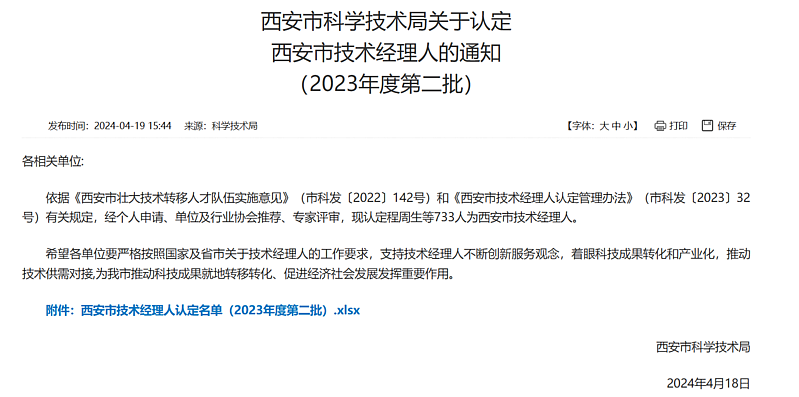 4月19日,西安市科學技術局發布了關于認定西安市技術經理人的通知(2023年度第二批),灃西科創&MIC13人通過認定。截至目前,灃西科創&MIC已有陜西省技術經理人7人,西安市技術經理人24人,技術經理人執業資格24人。
