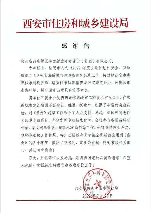 近日,灃西集團收到一封來自西安市住房和城鄉(xiāng)建設(shè)局的感謝信,信中對集團下屬企業(yè)陜西西咸海綿城市工程技術(shù)有限公司協(xié)助編制《西安市海綿城市建設(shè)條例》過程中展現(xiàn)出的專業(yè)水平與職業(yè)素養(yǎng)表示高度認可與贊揚。感謝信指出,作為《西安市海綿城市建設(shè)條例》起草專班團隊,海綿城市技術(shù)公司充分發(fā)揮實踐經(jīng)驗豐富、專業(yè)技術(shù)領(lǐng)先等優(yōu)勢,全程參與各區(qū)縣調(diào)研評估、條文起草...