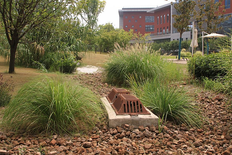 北方夏季雨水集中,如何避免城市短時積水問題?為此,魯偉根據儲排結合原則自創了一種低于路面的“雨水花園”。雨水花園相當于一個蓄水池,中間低兩邊高,城市雨水聚集在花園中形成一個天然的蓄水池?;▓@中的植物分散種植,建筑廢料則分散堆積在植物周圍,與土壤接觸的區域是中空的,水流可以滲到地下,防止地表出現積水。若雨水達到一定極限,則通過地下溝渠或過濾透水層分流入景區人造湖泊或河流,從而杜絕雨水溢滿現象。